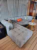 Classic and modern L-Shaped sectional sofa upholstered in light grey fabric with a quilted , tufted design that adds depth and comfort. Perfect blend for both comfort and relaxation