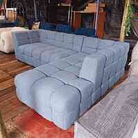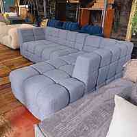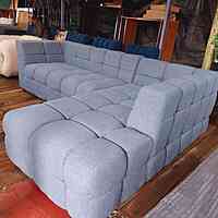 Modern L-Shaped sectional sofa in a soft dove grey tone, featuring a unique tufted,cube-like design that gives it a plush and contemporary look. Made of hardwood timber, HD cushions and quality finishing